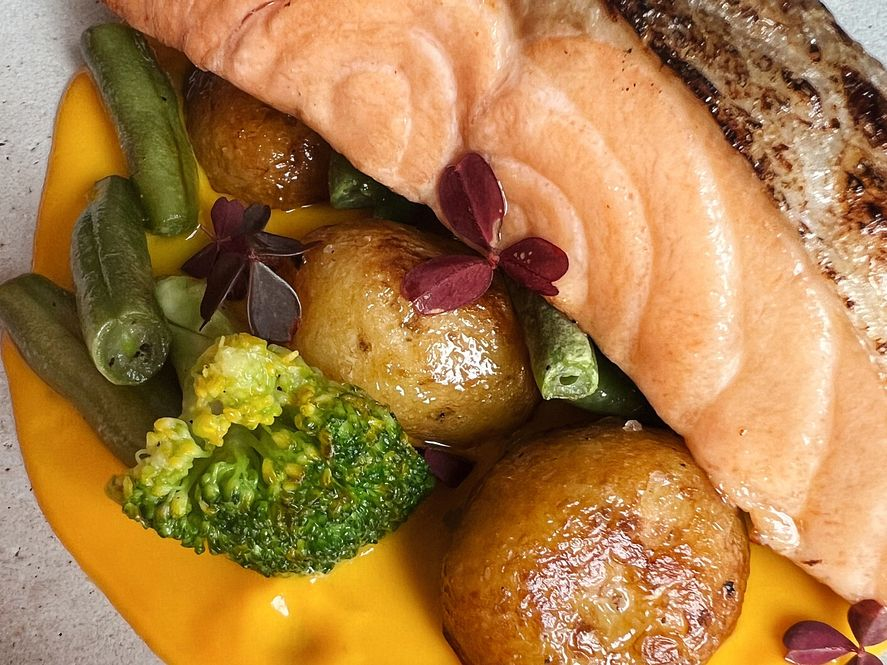 Запечений лосось, томатний соус з додаванням цибулі та часника, молода картопля, брокколі та спаржа