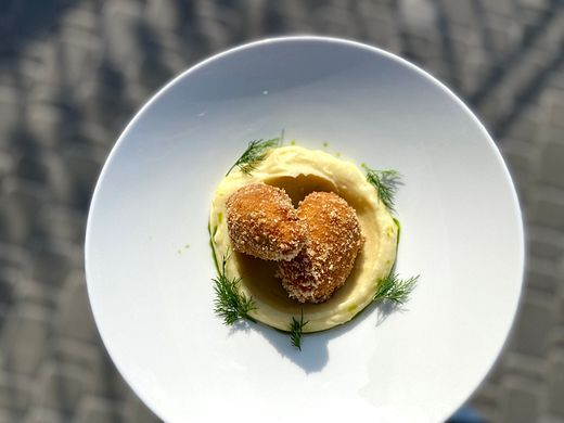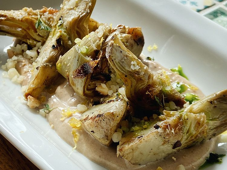 Артишоки на грилі, мус з фети, цедра лимону, фундук