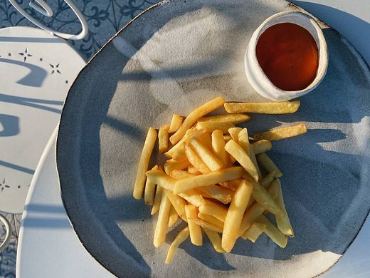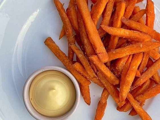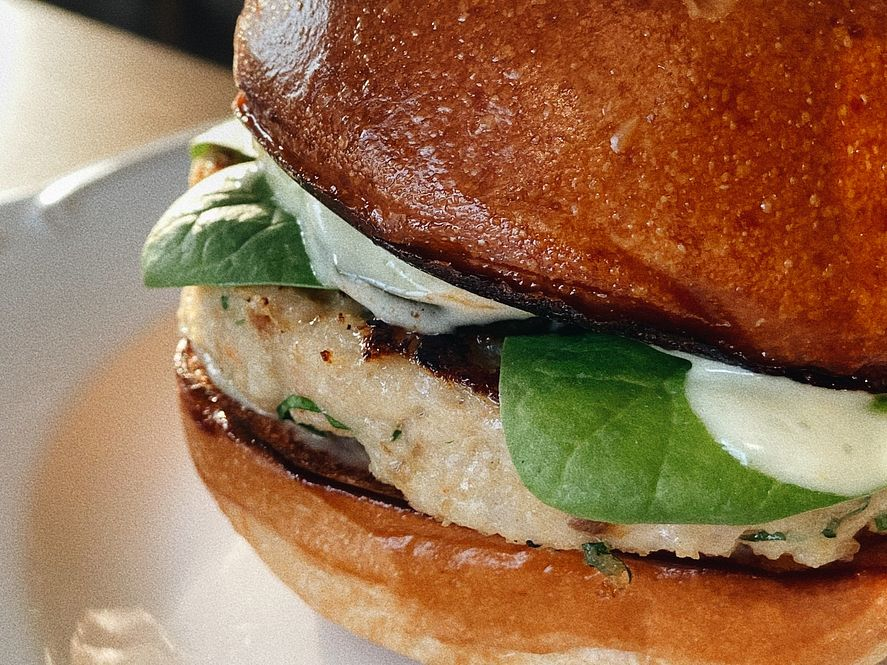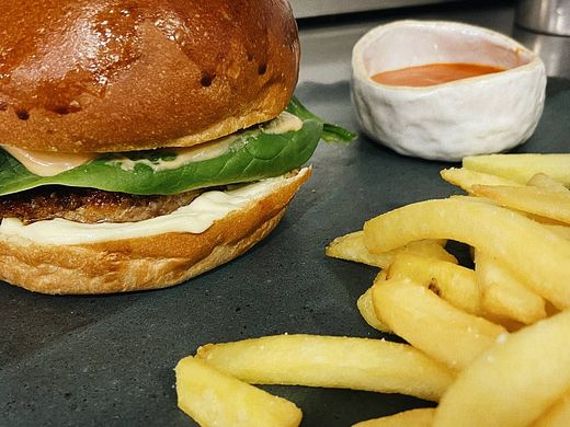 Булочка бріош, битий огірок, котлетка з креветок та білої риби з вершками, петрушкою та цибулею, листя шпинату, соус світ-чілі, сирний соус, картопля фрі