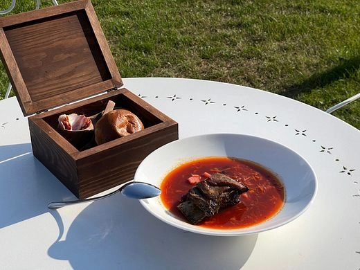 Борщ, яловиче ціле ребро, булочка бріош, сметана та копчена грудинка