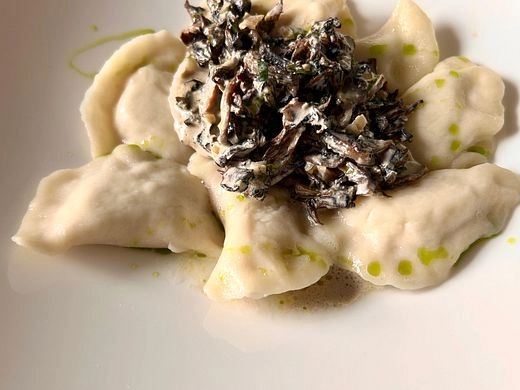 Вареники з картоплею, шампіньйони, білі гриби, петрушка, вершки, масло з кріпу