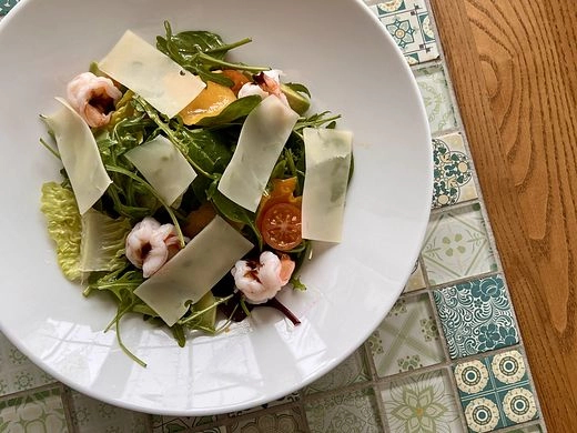 Мікс салат, чері, креветка, авокадо, манго, пармезан, бальзамічна заправка