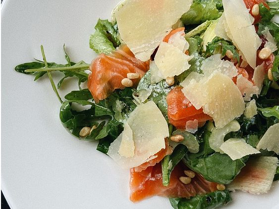 Мікс салат, слабосолений лосось, авокадо, стебло селери, кедровий горіх, медово-гірчична заправка