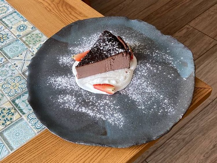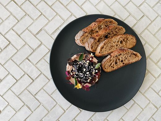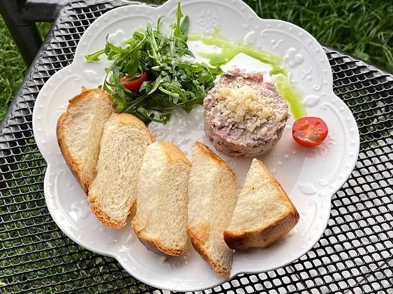 Рублене м’ясо телячої вирізки, анчоуси, корнішони, соус айолі, табаско, шпинат, рукола, пармезан, булочка бріош, оливкова олія