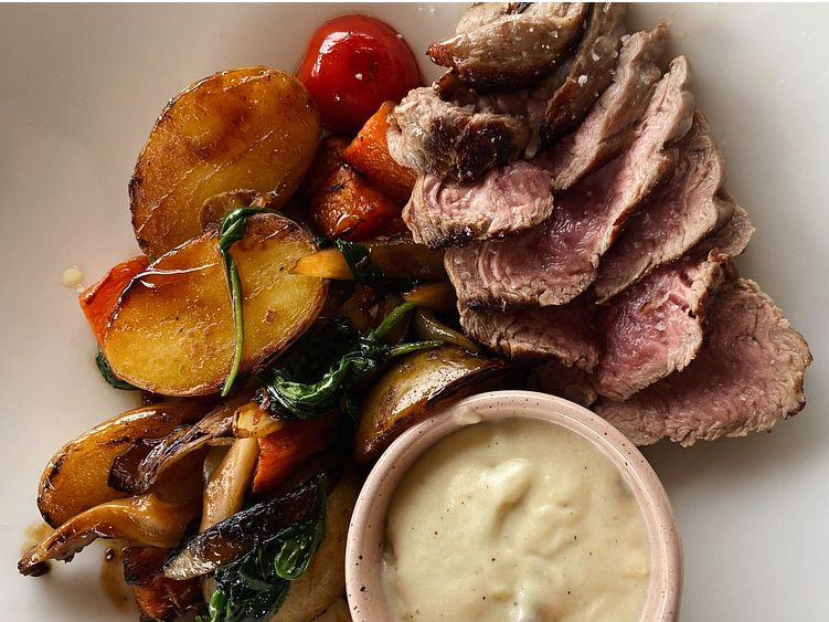 Теляча вирізка медіум-ре, картопля, печений гарбуз, томати, шампіньйони, цибуля дим, шпинат. Подається з перечним соусом