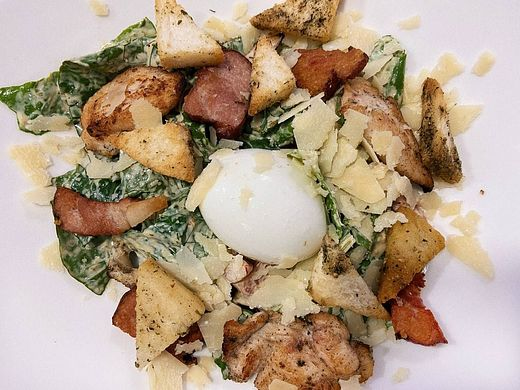 Листя салату ромен, томати чері, курка, бекон, крутони, пармезан, соус цезар, перепелине яйце